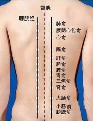 捏脊法主要作用于各脏腑背俞穴(即足太阳膀胱经循行在背部的俞穴)、督脉循行在背部的各穴和华佗夹脊穴(部分背俞穴见附图)。