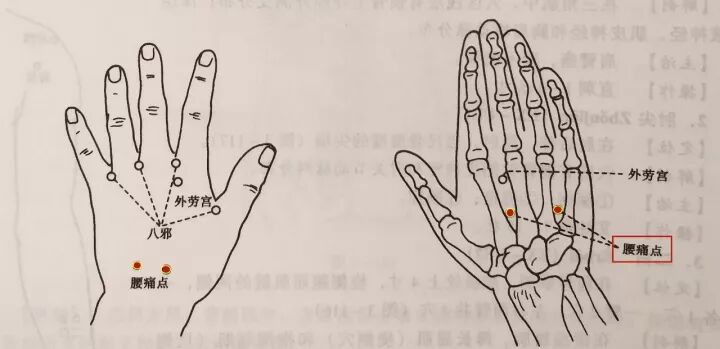 患者伏掌取穴。腰痛点在手背指,当第二、三掌骨及第四、五掌骨之间,当腕横纹与掌指关节中点处,一侧2个穴位,左右共4穴。