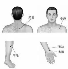 取穴:太渊、复溜、尺泽(太渊为肺经之原穴能平补平泻,尺泽穴生下来就是泄穴所以常用来平气解肺之热,不宜补。取复溜穴的原因是因为肺气之根在肾。)