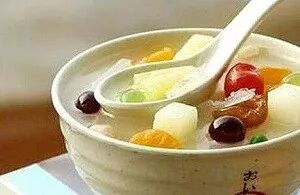 【制作方法】将青梅、山楂糕切成粒,雪梨切成小片,糯米粉制成豌豆大小汤元。将锅洗净,置于火上,加水烧开,放入加工过的葛仙米、百合煮一下,加白糖。待糖溶化后,再下小汤元,并放入山楂、青梅、雪梨、橘子瓣、醪糟汁烧开,滴白醋起锅入盆。