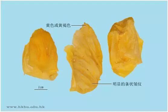 鸡内金一般呈不规则的卷片,厚约2mm,表面黄色、黄绿色或黄褐色,薄而半透明,有明显的条状皱纹,质脆,易碎。断面角质样有光泽。气微腥、味微苦。