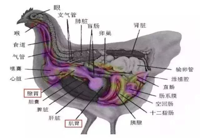 腺胃能分泌盐酸和蛋白酶等消化液,食物在腺胃中停留的时间很短,和消化液混合后就进入肌胃。肌胃的胃壁特别发达,由坚厚的肌肉构成。也是爆炒鸡胗的来源。