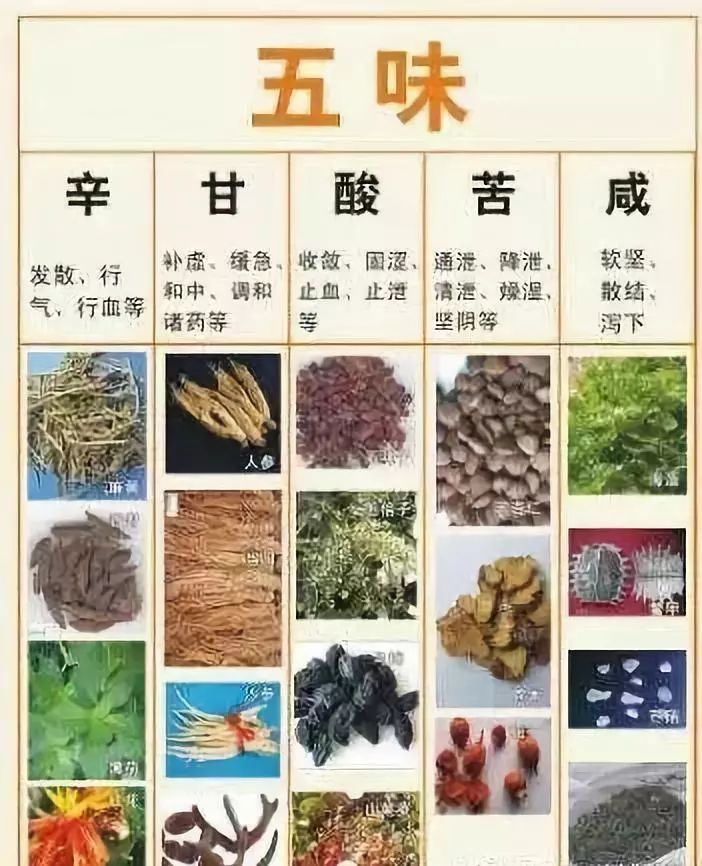 同理,中医发现,酸味具有收敛、涩滞的作用,苦味具有泻火、燥湿的作用,甘味药具有补益和缓的作用,咸味药具有泻下、软坚的作用,淡味具有利水渗湿的作用。