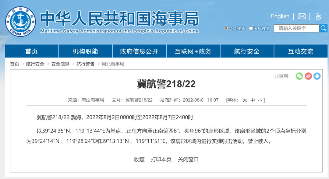 据中国海事局网站消息,8月1日,唐山海事局、大连海事局、清澜海事局发布航行警告,涉及南海海域和渤海部分区域↓↓↓