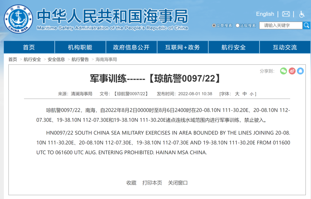 琼航警0097/22,南海,自2022年8月2日0000时至8月6日2400时在20-08.10N 111-30.20E、20-08.10N 112-07.30E、19-38.10N 112-07.30E和19-38.10N 111-30.20E诸点连线水域范围内进行军事训练,禁止驶入。