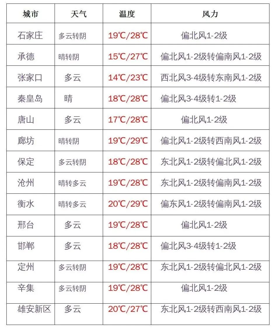 【阳光回归 气温回落】今天白天,张家口南部、保定西北部多云转阴有阵雨或零星阵雨,其他地区多云间晴。今日起我省气温明显回落,各地最高气温均低于30℃。今天石家庄最低气温19℃,最高气温28℃。