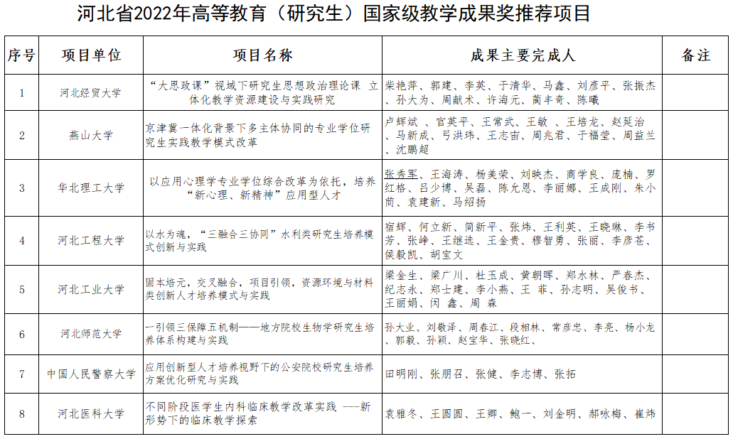 现对河北省2022年高等教育(研究生)国家级教学成果奖推荐项目进行公示,公示期为2022年10月13日至10月19日。