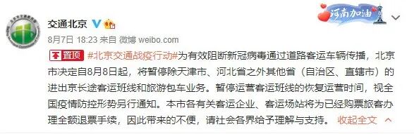 据“交通北京”官方微博消息,为有效阻断新冠病毒通过道路客运车辆传播,北京市决定自8月8日起,暂停除天津市、河北省之外其他省(自治区、直辖市)的进出京长途客运班线和旅游包车业务。暂停运营客运班线的恢复运营时间,视全国疫情防控形势另行通知。