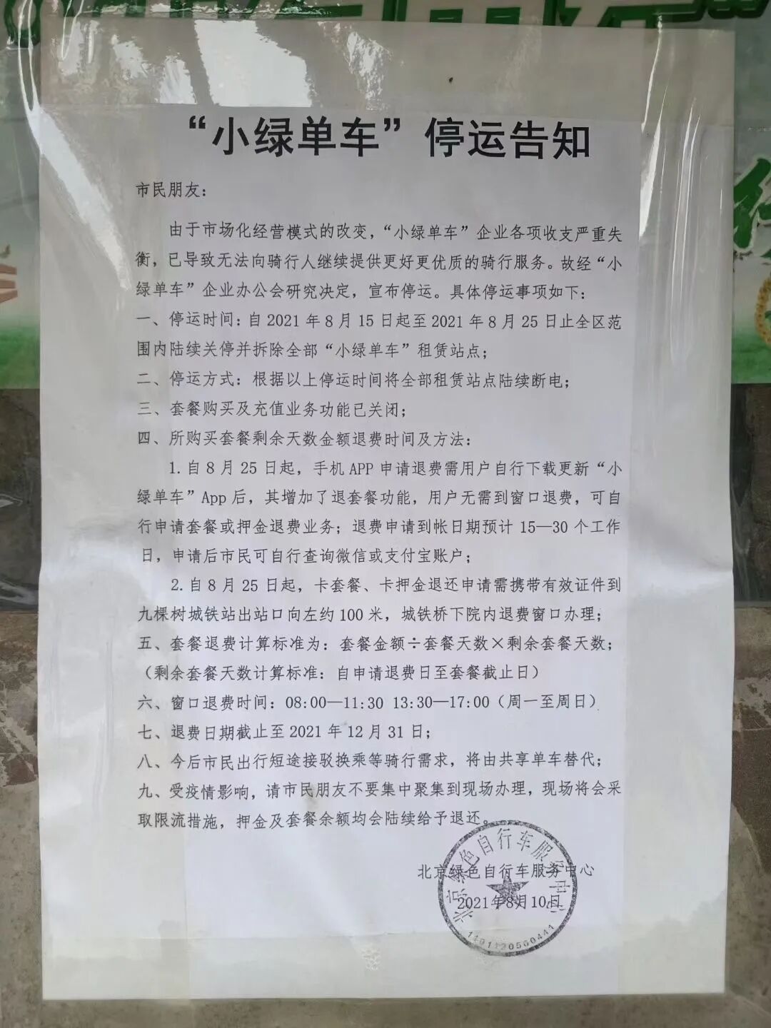 一、停运时间:自2021年8月15日起至2021年8月25日止全区范围内陆续关停并拆除全部“小绿单车”租赁站点;