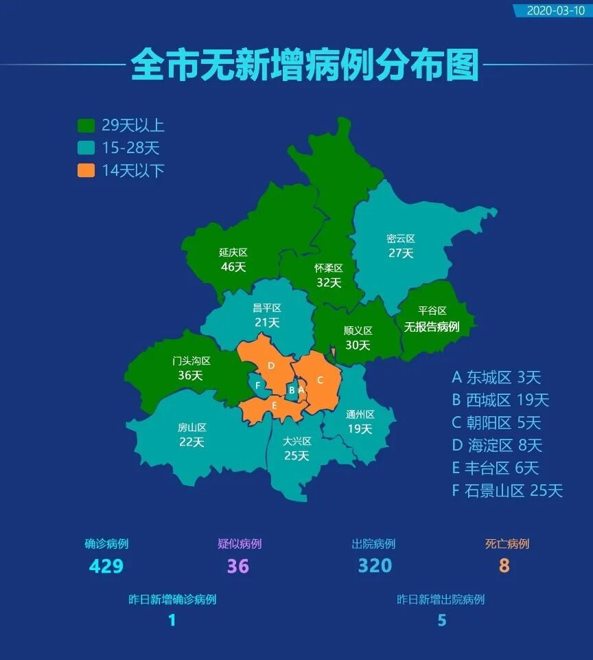 截至3月9日24时,累计确诊病例429例,治愈出院病例320例,死亡病例8例。现有疑似病例36例。累计确定密切接触者3650人,其中467人尚在隔离医学观察中。确诊病例中东城区14例、西城区53例、朝阳区72例、海淀区63例、丰台区43例、石景山区14例、门头沟3例、房山区16例、通州区19例、顺义区10例、昌平区29例、大兴区39例、怀柔区7例、密云区7例、延庆区1例,平谷区尚未有病例,外地来京病例25例,境外输入病例14例。![]()