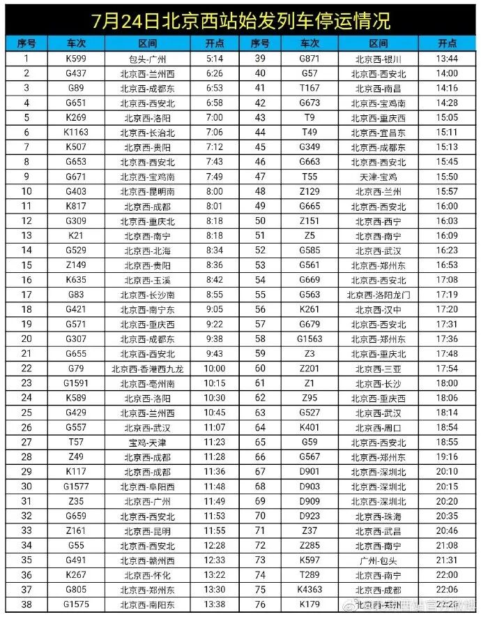 受多地持续强降雨天气影响,今天,北京西站和北京站共有83趟始发列车停运。