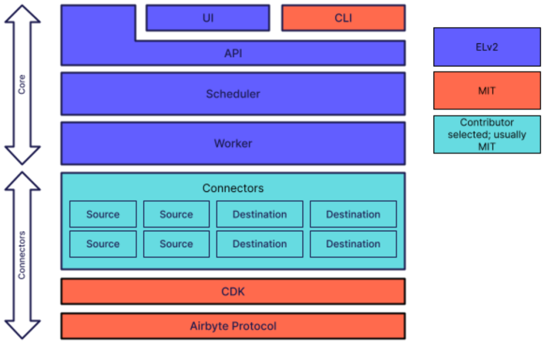 上图是 Airbyte 的软件协议模型,其核心服务部分是由 ELv2 许可的,而作为周边生态的命令行工具和连接器框架则是 MIT 许可的。这很像 GitHub 的商业模式,核心服务器的代码是专有软件,Airbyte 在 ELv2 下公开其源代码,而 GitHub 完全不公开源代码。周边生态,对于 Airbyte 来说是重要的各个不同数据源和数据汇的连接器,对于 GitHub 来说则是 REST API 和 CLI 及其衍生工具,以及 GitHub Actions 的社群实现,则是完全开放的。