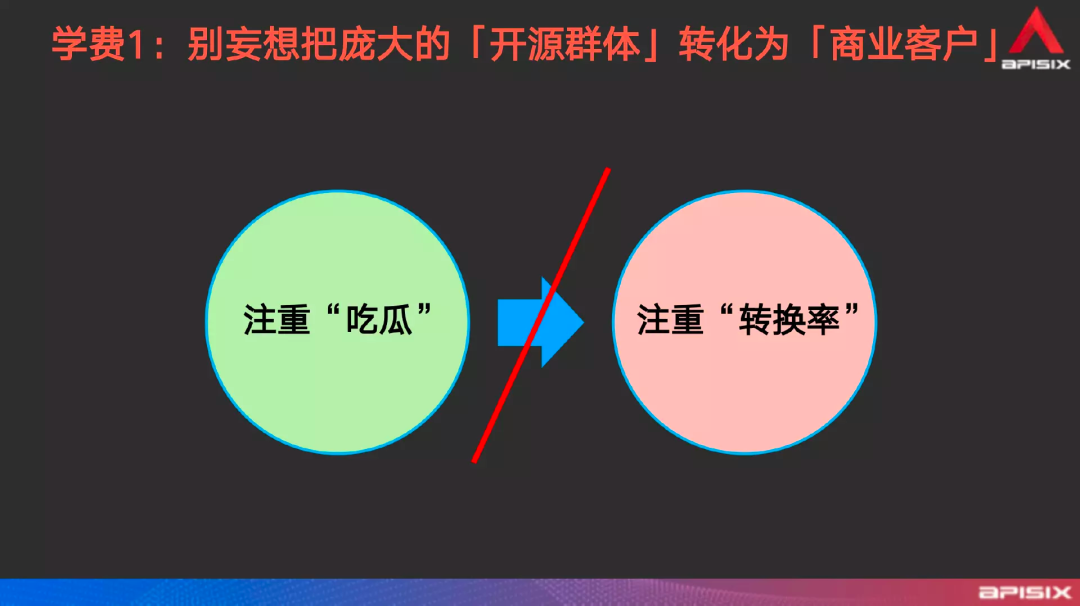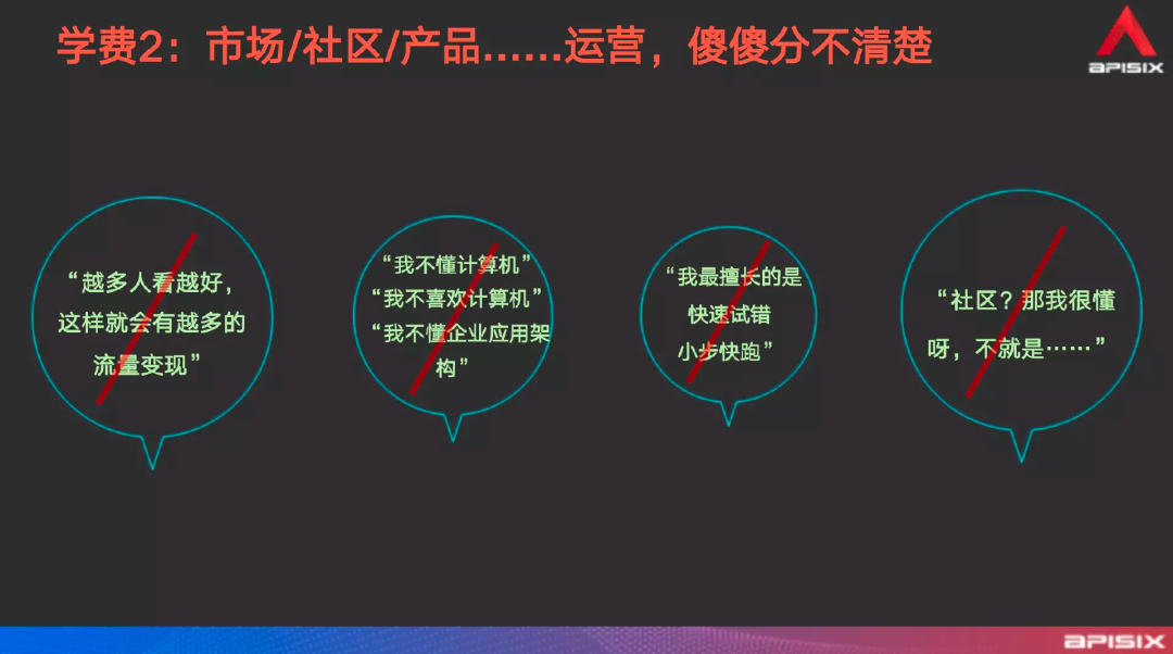 但是这个客户在我跟进了几个月之后就不了了之了。原因是什么呢?是因为他们公司的 CTO 根本无法明白“为什么用了一个开源的东西还要付费”。 所以通过这件事情你会看到,如果按照商业化的逻辑来理解,100 家里面有 2 家使用付费模式了,项目商业化转换率是 2%,这个没有任何毛病。但是在实际运行的过程中,你会发现开源群体永远是开源群体,商业群体永远是商业群体,它中间没有绝对的转化率,而且无法用这种体系化公式来进行计算。在国内技术氛围下,互联网公司是比一些传统企业在技术上更具前瞻性。所以 APISIX 这项技术更容易打入互联网公司。那么互联网公司拥抱了未来的技术,他们是否能够给我们付钱呢?不好意思,互联网公司不但不会给你钱,他还想赚你的钱。因为互联网公司的整体基因就是,它技术虽然用得很先进,但是它的付费意愿则更愿意把钱投到自己这一侧。即小步快跑,快速试错,所以他们更希望自己的人能够把握核心技术和源代码,能第一时间解决问题。所以在这种前提下,我们是根本不可能在互联网公司赚到钱的。 所以转化率这件事,不要按照想当然地去考虑。面对不同的用户,他们各自决策者的想法又是不同的。 | 踩坑2:市场/社区/产品多类运营,傻傻分不清楚大家平时看招聘软件会发现有很多种运营,什么市场、社区、产品运营等等。但具体我们这个模式下的运营到底要干什么,很多人都不清楚。现在的很多流量都是通过一些视觉效果去吸引这种快速流量。无论这个流量干净与否,目的都是为了将流量变大,去吸引一些真正对商品有兴趣的人。至于真正付钱的人有多少你可能不在乎,你只觉得这次流量吸引地不错。但是这种在我们这里是没用的,为什么不需要?前文已经提到了这套体系下的运营职责,所以我们不需要这样的。第二,不要不懂计算机、企业应用架构或者开源社区的运营因为你要面对的这个项目或者社区它并不像日常自媒体渠道那么广泛,它是需要一些专业知识底蕴的。所以我们在招聘时会更多倾向有这些经验的人。如果你不懂这些背景,那来这里做运营也是没有价值的。现在很多互联网公司都讲究敏捷和快速试错,就是基于一些自己的经验或者用一些手段让技术快速实现,然后进行市场试探进而快速反馈。开源社区运营也是需要这种模式,在快速试错的过程中,快速收集市场的数据,然后反馈调整后续动作。好多人看到社区运营,以为是那种自媒体变现管理粉丝群的那种运营方式,不是的。开源社区运营并不是管理粉丝,而是为使用者和开发者提供更好的产品服务。产品用的人越多,就会有越多的人会产生商业需求等,这就是后续的商业化事情了。| 踩坑3:“那种” Technical Writer,只是一种奢望从我多年技术团队管理的经验来看,如果一个岗位放到市场上连续两三个月还没招到人的话,你就应该停下来复盘,去想一想你这个岗位设置得合理还是不合理。所谓 Technical Writer 就是技术写作专业者,如果单针对 APISIX 社区的话那就是“他需要懂 NGINX 或 OpenResy、理解开源文化、有后端开发经验、具有多年写作习惯、逻辑和表达都很清楚等”。当把这些条件全部加上去后,我相信你招三年也招不到,不可能有这样的人。首先写作和开发,它是文科和理科之间的矛盾;其次有经验的程序员去转写作方向的非常少,且同时NGINX 和 OpenResty 本身就是比较小众的技术领域知识,能了解或者熟悉的人少之又少。拿我自己来说,我有多年的写作经验,同时也是后端开发出身,还懂开源。但是 GitHub、NGINX 和 OpenResty 我也不熟悉。 所以从这种 “既要、又要、还要” 的条件下,这个岗位究竟合理与否真的是需要决策者去衡量的。不过,可能决策者并不考虑这些问题,所以针对岗位设定上就会存在一些哥德巴赫猜想。也就是说这个岗位他可能是从某片文章或者某个大公司的岗位中看到过,所以他觉得这个岗位在这里也应该存在。所以现在针对内容输出方向,我们对外招聘就是“技术编辑”的岗位,主要负责基于一些素材内容加工处理成一篇成熟的文章。什么事情都不能一口吃成胖子。在近两年的时间里,不管是我还是团队的其他小伙伴,我们都或多或少收获了来自外界的夸奖。 从我个人获得的这些信息来看,这近两年的社区运营效果其实还是非常不错的。通过实践我们也走出了这么一套运营体系,同时也发现了基于 Content Marketing 这种方式确实是比较经济的,但是会对内容质量的要求较高,也就是回归到关键点“强依赖于高质量内容”的打法。 以上就是我自己从 Apache APISIX 开源社区运营近两年的实践经验总结,也期待各位对开源运营感兴趣的小伙伴分享更多有趣的故事。