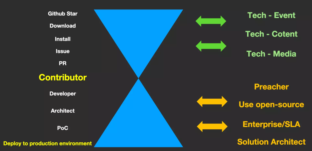 上边这张图来源于温铭之前某一次的分享,基于他的内容我补充了下半部分漏斗。整张图就是一个开源项目的转换率漏斗。 比如一开始你了解到这个开源项目,觉得它还不错,就给它点个 star。之后你又继续研究了一下,有了想要使用这个项目的冲动,于是就下载下来,之后可能就开始应用到自己的实际生产环境中了。在使用过程中,你可能对这个项目的一些 bug 或者功能有些自己的想法,就会通过在 GitHub 上提 issue 或者 PR 进行汇报和解决。在这个过程中,你可能就会从这个项目的 contributor 逐渐转变为项目开发者或者规模化使用者。进而就有可能会产生商业需求,最终成为一个标准的商业用户。 漏斗右侧则是从目前开源项目的一些运营角度,即针对左侧使用者的演进进行的一些活动。主要从三个维度进行,比如活动、内容和媒体渠道,让更多的人去了解。经过这一年多的摸爬滚打,我自己对于开源社区的运营方式有了更加清晰的认知。去年 4 月份,温铭(前公司CEO)有让吴晟(Apache SkyWalking创始人)来做 APISIX 社区开源方面的顾问指导,吴晟就提出过一个观点 “如果想在国内打出一定的口碑和市场,你必须去找一个在圈内有一定 IP 或者是个人影响力的人”,对这个项目进行一些运营相关的操作。所以温铭他们后来遇到了我,而我刚好也对 Apache 文化比较认可,包括对吴晟也非常认可。 在加入之后,我就一直在不断优化 “个人 IP + 市场营销手段 + Apache软件基金会 = 以 Inband 漏斗模型为基础,且强依赖高质量内容” 的社区运营打法。不可否认,在大家眼里我不仅是一个技术网红,而且近些年在各种技术大会、文章及视频中的出镜率比较高,因此也累计起不少的“粉丝”与人脉关系,技术圈里也有很多人知道我。 再加上我自己近十几年都在甲方工作,与不少甲方的技术负责人都比较熟悉,所以我就可以利用自己的个人 IP 进行一些相关动作。其次这里说的营销手段虽然说跟自媒体运营手段差不多,但是行为目的是不一样的。最后,要学会利用 Apache 软件基金会的一些理念,依靠大方向背书与高质量内容进行强配合,去完善这一套社区运营体系。开源社区运营,首先我们要搞清楚你运营的是谁。在开源社区里面,它其实有两大对象,一个是开发者,另一个就是使用者。