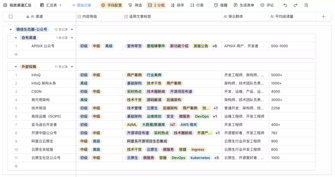 那么面对开发者其实就是想获取更多的贡献者,让更多的人来为项目献计献策。比如我们很多微信群和 QQ 群包括 GitHub 上的 issue 等,这些都是针对开发人员进行相关问题回复和解决。这一部分一般都会由这个项目的主要开发者进行维护和推进,因为他们是最了解这个产品的人群,对于开发体验上他们有更清晰的产品认知和更快的跟进速度,而开源社区运营团队其实更多面向产品使用者,而不是开发者。这个使用者他不是单指会用产品的开发人员,还包括一些企业层面的决策者,比如正在进行选型的一些企业用户。通过我们产出的内容去吸引更多的开源用户,使用的企业越多就会产出更多的用户案例去吸引更多的企业使用,然后漏斗就会变得更大。通过不断地参加各种会议,去分享开源产品相关的功能也好,社区运营也罢,通过个人 IP 去不断走访企业或者公共场合去挖掘更多的潜在用户。总之就是靠个人力量进一步将产品的知名度扩大。多与其他社区项目进行联合,比如双方共同举行 meetup 等。在我来之前,APISIX 相关的 meetup 基本都是温铭或者院生自己独立举行的,规模非常小宣传力度也不大。我来了之后基本就不再独立举办活动了,因为现在的方向已经很清楚了,你希望让更多的人知道 APISIX,那就需要有更多的渠道来帮助你散播,所以我就开始跟其他的开源社区去合作,尤其是跟我们的 API 上游生态链相关的,比如 Dubbo、RocketMQ、Nacos 等。另外还会去跟一些生态不相关的项目合作,比如 Doris、白鲸开源等,他们属于数据库生态。那么数据库生态其实跟 APISIX 是完全没有关系的,但为什么还要跟他们去合作呢?因为希望通过蹭流量的方式,让更多不在我们生态内的开发和技术人员了解到。在我来之前,APISIX 公众号当时是温铭自己一个人搞,所以质量包括美观程度上也会有所限制。那么我来了之后,像知乎、视频号等一系列媒体渠道都是我一手操办起来的。利用这些渠道开始强化 APISIX 的品牌,利用布道和活动所产生的内容进行二次传播,将有价值的内容进行沉淀。因为我自己平时也写公众号等内容,很多媒体也会转发我的内容,跟这些媒体都有很好的合作,所以我就开始与这些媒体进行 APISIX 项目的合作。比如大家现在熟悉的一些公众号和技术媒体,我们都进行了相关的合作。通过与这些一线的技术媒体建立合作,把我们的 KA 用户案例内容和和大版本更新等进行多渠道投稿去扩散。我在前边也多次提到了「依赖高质量内容」的打法,那么具体是如何基于内容去实现增长的呢?