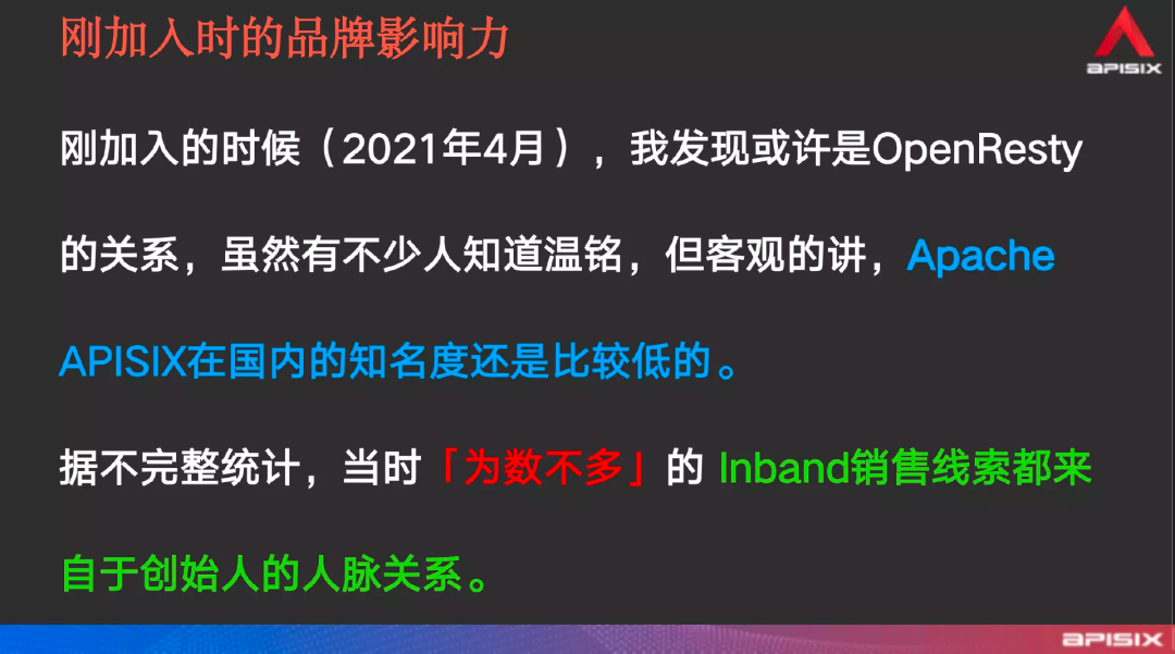同时据我了解,当时为数不多的 Inband 销售线索都是来自两位发起人的人脉关系,更多是来自于他们之前做 OpenResty 积累的人脉,而且在一年半之前,APISIX 在国内的认知基本就是在这种状态下。