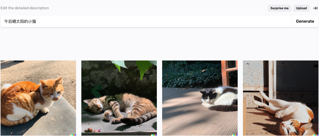 它能够将文本描述映射到对应的图像,并生成对应的图像。例如,如果向 DALL·E 提供文本描述“午后晒太阳的小猫”,它就会生成一张图片,展示一只猫在晒太阳。需要注意的是 DALL·E 并未完全开源,下图是用最新的 DALL·E 2 生成,该项目没有开源仅提供生成图片的服务。