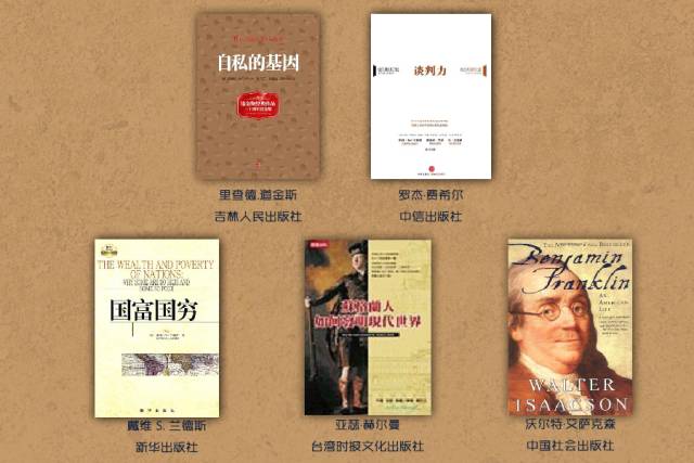1、《深奥的简洁》 作者:约翰·葛瑞本 出版社:湖南科技出版社 2、《泥鸽靶:华尔街高等金融实录》又名《诚信的背后》 作者:帕特诺伊 出版社:当代中国出版社 3、《第三种猩猩:人类的身世与未来》 作者:杰拉德・戴蒙德 出版社: 海南出版社4、《影响力》 作者:罗伯特・西奥迪尼 出版社:中国人民大学出版社5、《只有偏执狂才能生存》作者:安迪·格鲁夫 出版社: 中信出版社6、《枪炮、病菌与钢铁:人类社会的命运》作者:贾雷德・戴蒙德 出版社:上海译文出版社7、《生活在极限之内:生态学、经济学和人口禁忌》作者:哈丁 出版社:上海译文出版社8、《洛克菲勒:一个关于财富的神话》作者:荣·切尔诺 出版社:海南出版社9、《自私的基因》 作者:里查德・道金斯 出版社:是吉林人民出版社10、《谈判力》 作者:罗杰·费希尔 出版社:中信出版社 11、《国富国穷》作者:戴维・兰德斯 出版社:新华出版社12、《苏格兰人如何发明现代世界:西欧最穷的国家如何创造了世界》 作者:亚瑟·赫尔曼 出版社:台湾时报文化出版企业13、《富兰克林传》 作者:沃尔特·艾萨克森 出版社:中国社会出版社14、《我生活的种种模式》 作者:赫尔伯特西蒙 出版社:东方出版中心15、《温度决定一切》 作者:吉诺沙格瑞 出版社:天下文化16、《冰河世纪》(Ice Age) Mary Gribbin Barnes Noble17、《三个科学家和他们各自的上帝:在信息时代寻找生命的意义》(Three Scientists and Their Gods) Robert Wright Harper Collins Publishers