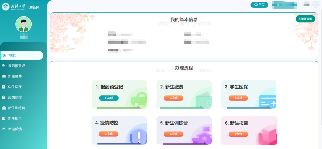 进入待办事项导航页,可以查看自己入校前需要准备事项,可以点击“重要提示”按钮查看相关提示。