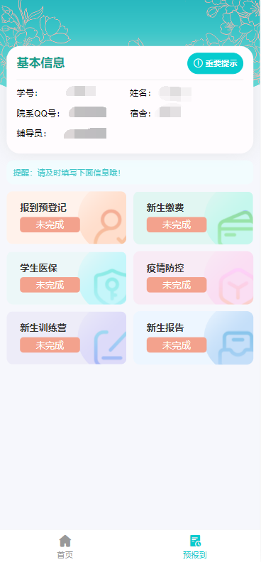 移动端登录成功后,点击“预报到”菜单按钮,进入待办事项导航页,可点击“重要提示”按钮查看相关提示。