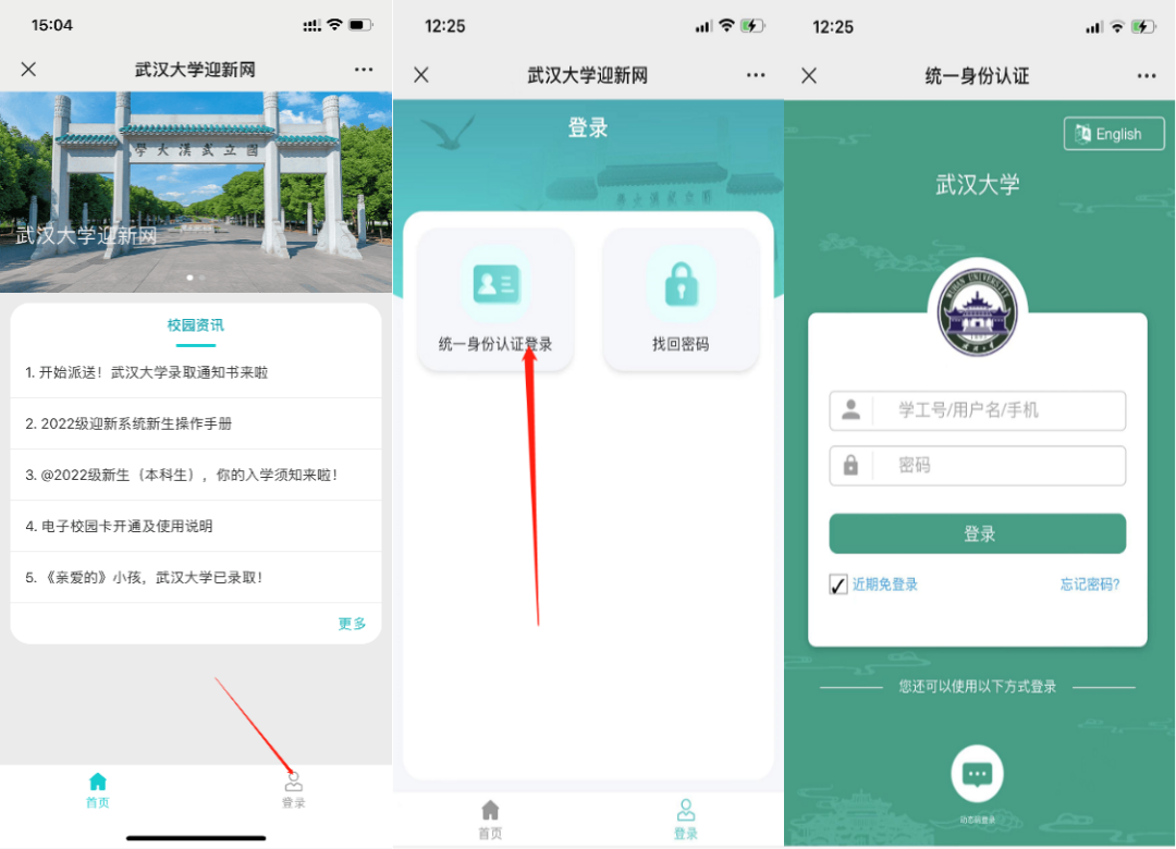 1)APP:手机应用商店或App Store搜索“智慧珞珈“APP--下载APP--进行统一身份认证登录--新生通道。