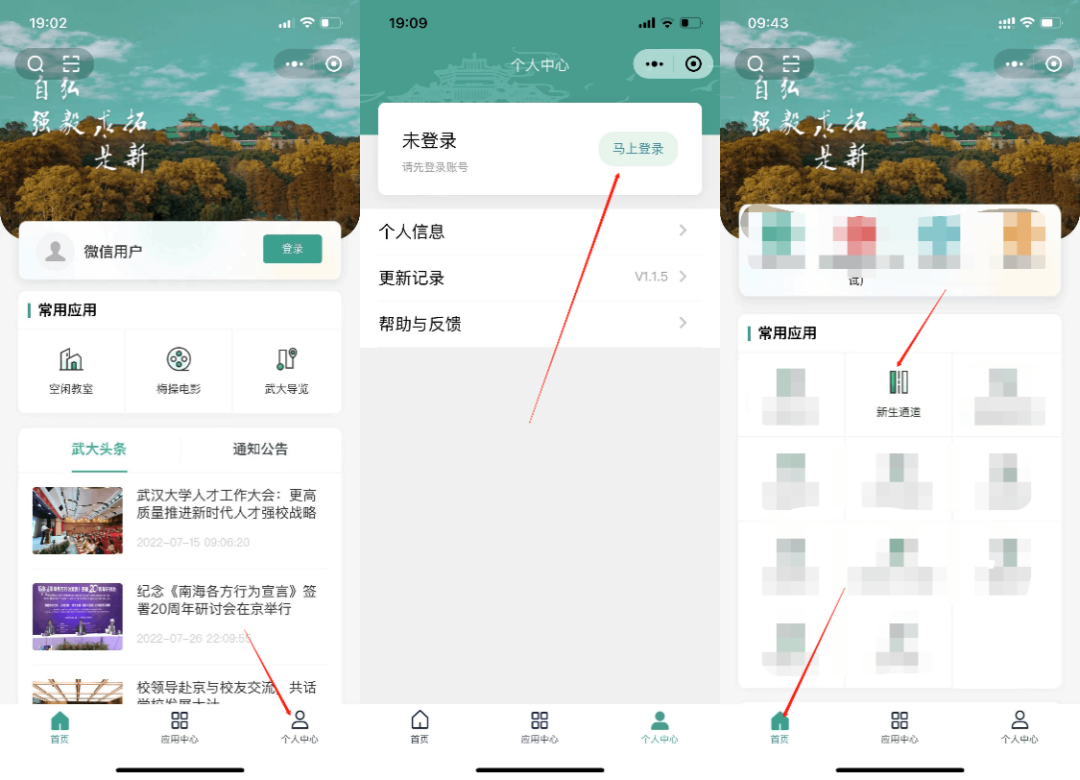 2)小程序:微信搜索“智慧珞珈“小程序--个人中心进行登录--首页--新生通道。