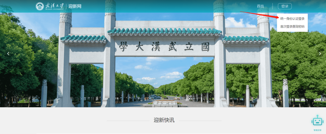浏览器输入:https://szyx.whu.edu.cn进入武汉大学迎新系统首页,点击登录--选择“统一身份认证”--输入账号(学号)、密码--进入迎新平台