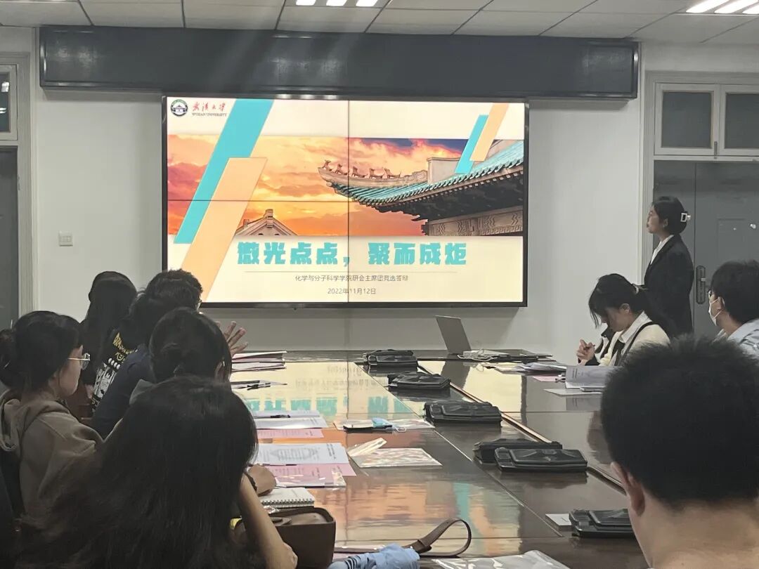 11月12日中午,武汉大学化学与分子科学学院第二十一届研究生代表大会常任代表委员会第二次全体会议于化西210会议室举行。学院团委副书记、研究生会秘书长武凌宇老师、学院常任代表委员会委员、学院研究生会主席团成员以及常代办部分工作人员参加会议,学院第二十届常任代表委员会办公室负责人王嘉欣同学主持本次会议。