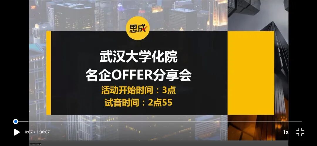 11月27日,武汉大学化学与分子科学学院研究生会携手思成求职,举办了“职引未来,名企offer线上经验交流会”,旨在为化学院的同学提供一个求职经验分享的平台,解答各位同学在求职过程中遇到的各种问题;让大家在求职过程中不再茫然,做到有的放矢,从容自如。在本次求职经验交流会中我们邀请到了王笑非师姐,宋宇航师兄以及思成求职CEO孔翔老师为大家分享求职经验。