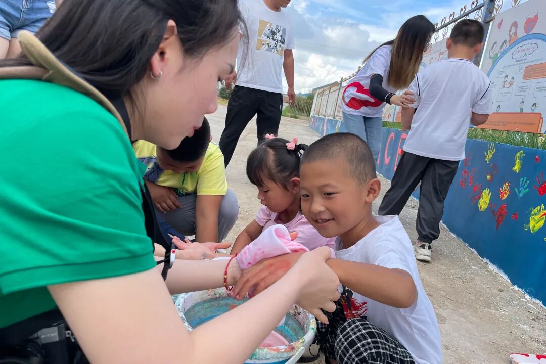 红旗幼儿园的小朋友也参与到了墙面绘制活动中。