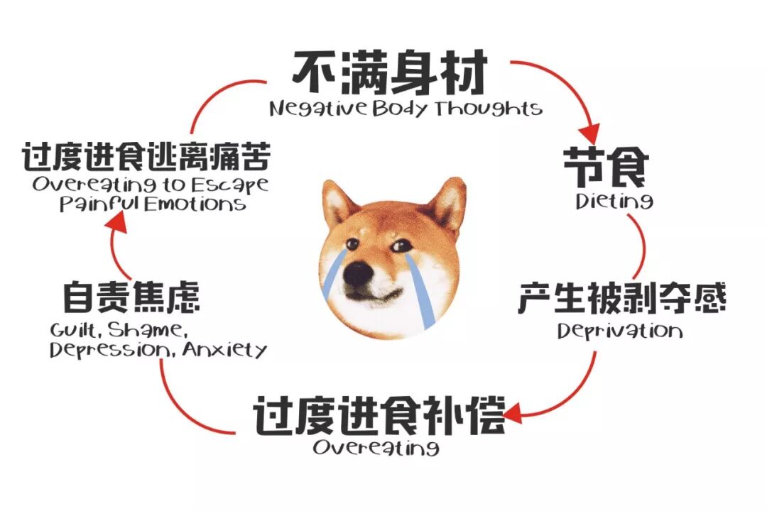 在杂志、电视等大众媒体“以瘦为美”的压力下,许多人对自己的外貌产生了负面评价。比起运动,他们中的一些更倾向于看似立刻起效的“节食”。然而节食者中的大多数会陷入“节食—暴食”的循环:节食将令人产生强烈的被剥夺感,导致过度进食的补偿行为,而补偿行为又会带来自责和焦虑,于是通过进食甚至暴食来逃离痛苦,随后又因身材问题开始节食,进入新一轮循环。