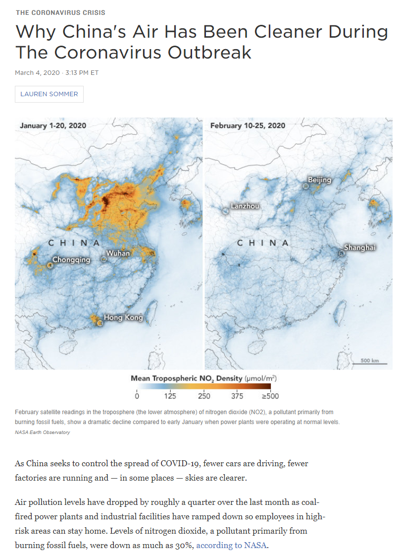 导读:NPR 报道了中国为控制新冠病毒传播而采取的一系列限制外出、暂缓复工等举措大幅降低了空气污染程度。昆山杜克大学和杜克大学全球环境健康教授张军锋指出,空气质量的提升将会减少更多的健康问题,尤其肺部和心血管健康将会得到改善。