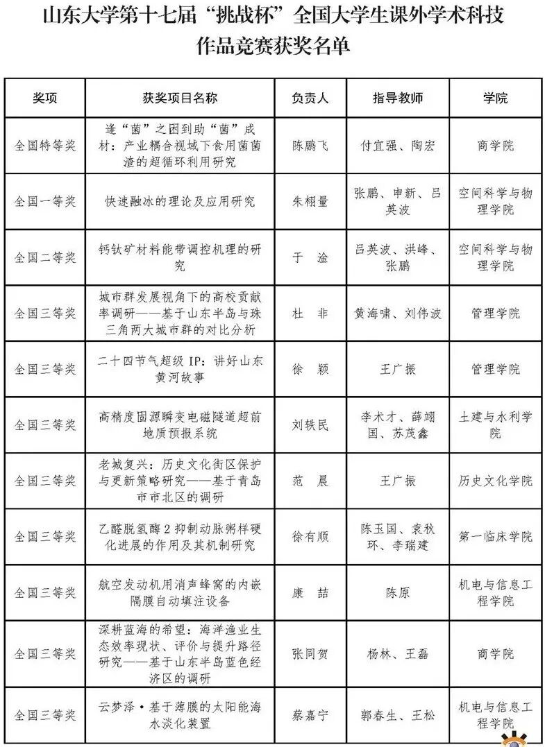 “挑战杯”竞赛被誉为当代大学生科技创新的“奥林匹克”盛会,在促进高校青年创新人才成长、深化创新创业教育、推动经济社会发展等方面发挥了积极作用。近日,第十七届“挑战杯”全国大学生课外学术科技作品竞赛获奖名单公布,山东大学学生获特等奖1项、一等奖1项、二等奖1项、三等奖8项。