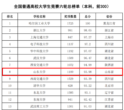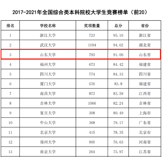 科创竞赛是双创人才培养的重要载体和平台。一直以来,山东大学积极组织和引导学生参与竞赛实践,培养学生创新精神,提高创新创业能力。2022年2月,2021全国普通高校大学生竞赛分析报告发布,山东大学在“2017-2021年全国综合类本科院校大学生竞赛榜单”中位列全国高校第三位,在“全国普通高校大学生竞赛六轮总榜单”和“2017-2021年全国普通高校大学生竞赛榜单”中均位列全国高校第八位,彰显了学校在创新创业教育、人才创新实践培养方面取得的显著成效。