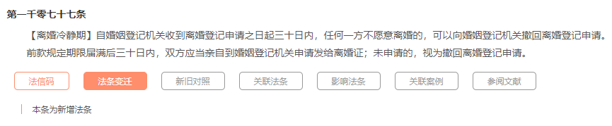 之所以设置30日的离婚冷静期,是在保护当事人离婚自由与防止轻率型离婚之间的利益寻找平衡,既避免冷静期时间太长损害当事人的离婚自由,又避免冷静期时间太短无法达到“冷静”的效果。《民法典》第1077条,两款都规定了30日,但两个30日的效力不同,对当事人和婚姻登记机关行为的约束不同,因此法律后果也是不同的。该条第1款规定的30日冷静期是不变期间,即婚姻登记机关在收到离婚登记申请之日后30日内不会办理离婚登记手续,在此期间任何一方均可以撤回离婚登记申请,因此,第1款规定的30日是典型的离婚冷静期。本条第2款规定的30日是可变期间,即在30日离婚冷静期届满后的30日内,如夫妻双方亲自到婚姻登记机关申请发给离婚证,婚姻登记机关在审查符合离婚登记条件的,应当发给离婚证;如在此期间男女双方没有申请的,视为撤回离婚登记申请,婚姻登记机关不得基于双方最初的申请为其办理离婚登记。以上两款规定,明确了男女双方若要登记离婚,需要经过递交离婚登记申请后的 30 日离婚冷静期,在离婚冷静期届满后的30日内,还需要男女双方亲自到婚姻登记机关申请发给离婚证。如任何一方未到场申请确认的,视为双方未达成一致,不适用协议离婚的行政程序。