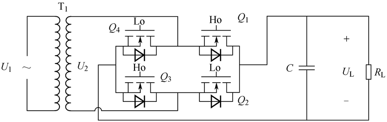 与二极管桥式整流电路一样,全桥式同步整流电路中的四个功率MOSFET管被分为两组Q1、Q3和Q2、Q4,由两组PWM波Ho,Lo控制交替导通。Ho,Lo是频率与输入交流电频率相同、占空比为50%的两组PWM信号,可由专用控制IC或微处理器产生。在正半周,Ho为高电平,驱动Q1、Q3导通,Lo为低电平,Q2、Q4关断;在负半周,Ho为低电平,驱动Q1、Q3导通,Lo为高电平,Q2、Q4关断。同时,为避免Q1、Q2或Q3、Q4两个功率MOSFET管同时导通造成短路而损毁电源。Ho,Lo两组PWM信号要加入一定量的死区时间。