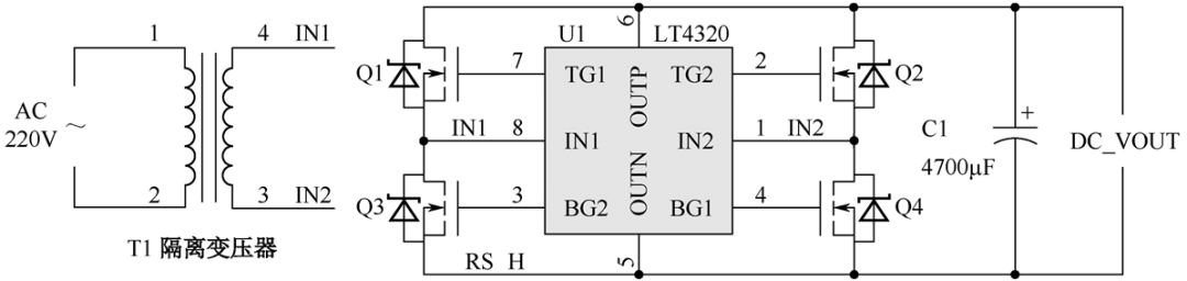 上图中,采用低损耗N沟道MOSFET替代了全波桥式整流器中的全部4个二极管,以显著地降低功率耗散。同时采用凌力尔特公司的理想二极管桥控制器LT4320,作为控制器产生PWM驱动信号。LT4320可设计用于DC至60Hz电压整流,LT4320开关控制电路通过检测输入交流电压的频率自动输出两组PWM驱动信号,平稳地驱动两个适当的功率MOSFET管导通,同时将另外两个功率MOSFET管保持在关断状态以防止反向电流,实现同步整流。