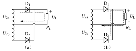 如图4(a)所示,在0~π 间内,U2a对D1为正向电压, U2b对D2为反向电压,则D1正向导通,D2反向截止,在RL上得到上正下负的半波电压;如图4(b)在时间π ~2π 内,U2a对D1为反向电压,U2b对D2为正向电压,则D1反向截止,D2正向导通,在RL上得到的仍然是上正下负的半波电压。如此反复,由于两个整流元件D1、D2轮流导电,在正半周、负半周两个作用期间,负载电阻RL上都有同一方向的电流通过,因此称为全波整流。