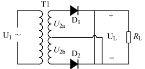如图2所示,U2 是方向和大小随时间变化的正弦波电压;在0~π的时间内, U2为正,变压器次级上端为正下端为负,则二极管 D1在正向电压作用下导通, RL上的电压 UL=U2;在 π~2π的时间内,U2 为负,变压器次级上端为负,下端为正,则二极管D1在反向电压的作用下截止, RL上无电压……周而复始,交流电U2的负半周就被"削掉"了,在RL上获得了一个单向直流电压,达到了将交流电转换为直流电的目的。因负载电压RL 的大小仍随时间不断变化,通常将它称为脉动直流电压。半波整流以牺牲一半功率为代价来换取整流效果,电能利用率很低。因此常用在高电压、小电流的场合,而在一般无线电等装置中很少采用。