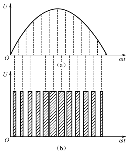 PWM控制就是对脉冲的宽度进行调制的技术。即通过对一系列脉冲的宽度进行调制,来等效地获得所需要波形(含形状和幅值)。PWM控制技术的理论基础为:冲量相等而形状不同的窄脉冲加在具有惯性的环节上时,其效果基本相同。冲量指窄脉冲的面积。效果基本相同,是指环节的输出响应波形基本相同。如下图3(a)(b)和(c)所示的三个波形分别为矩形波脉冲、三角波形脉冲以及正弦波形脉冲,显然它们的形状完全不同,但是面积完全相同,如果把它们分别加在具有同一个惯性的环节上时,其输出作用完全相同。