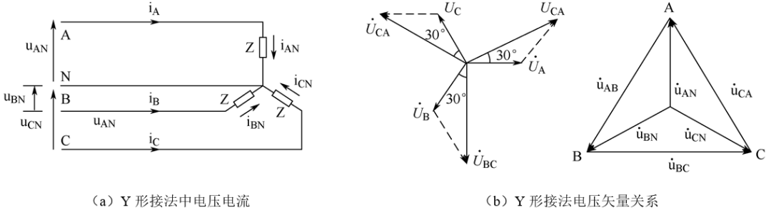 相电压:三相供电系统ABC三相分别对中性线的电压。如下图图7(a)Y型接法ABC三相电压Uan,Ubn,Ucn。