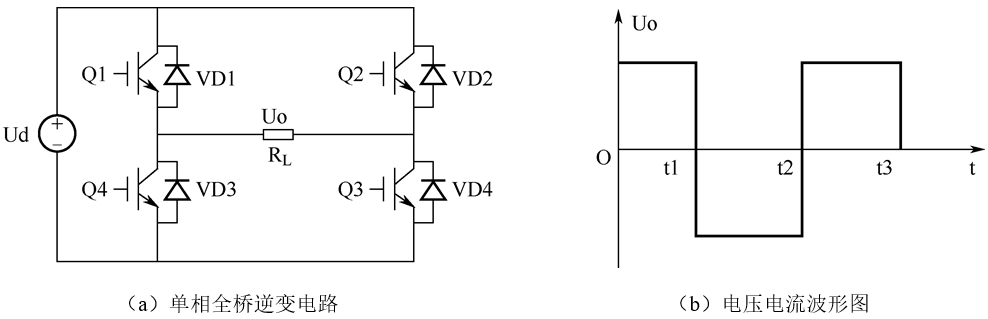 在大学生电子设计竞赛中,全桥式逆变电路是应用最广泛的一种电路。下面以下图图2(a)的单相全桥逆变电路说明全桥式逆变电路的基本原理。单相全桥逆变电路也称为‘H桥’电路,由四个功率开关管及其驱动辅助电路构成,工作时Q1与Q4通断互补、Q2与Q3通断互补。当Q1、Q3闭合,Q2、Q4断开时,负载电压Uo为正;当Q1、Q3断开,Q2、Q4闭合时,负载电压Uo为负,Uo波形如图2(b)所示。Q1、Q3和Q2、Q4交替导通,使得负载上获得交流电能。当负载不是纯电阻时,负载电压和负载电流不是同相位,这时开关管的寄生二极管D1-D4则起着电流续流的作用。