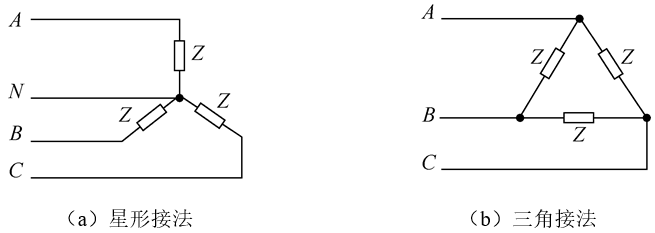 星形接法:也称Y型接法,如下图图5(a)所示每一相的负载的一端都接在公共点上。公共点为中性点,N为中性线。