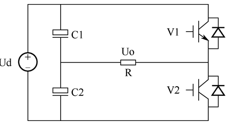 从直流电源中获取交流电能,有多种方式,但至少需要两个功率开关器件,如图1所示的半桥式逆变电路是单相逆变电源的一种拓扑结构。此电路由两个串联的功率开关和两只串联的电容组成。两只串联电容的中点为参考点。电路工作原理如下:当V1导通V2关断时,电容C1上的能量释放到负载R上,输出电压Uo为正,同时电容C2充电;当V1关断V2导通时,电容C2上的能量释放到负载R上,输出电压Uo为负,同时电容C1充电。开关管V1、V2交替导通使得负载获得交流电能。