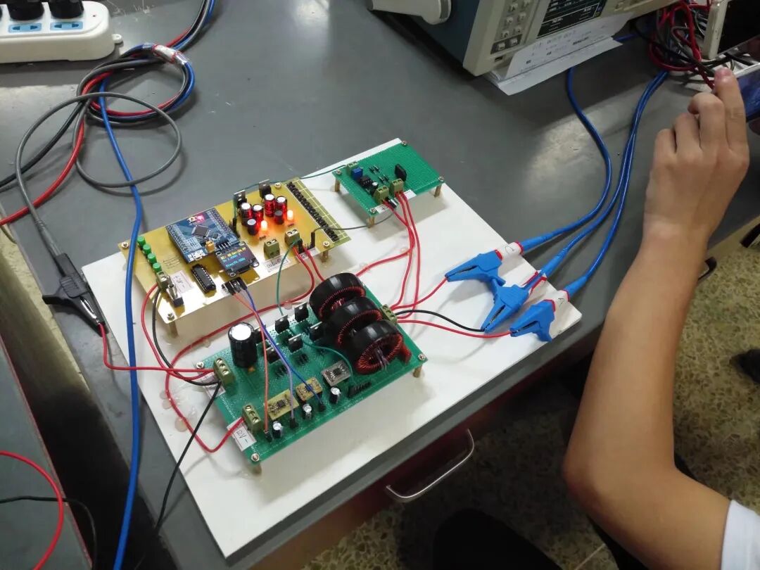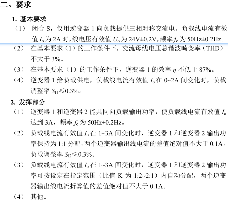图中,两个三相逆变模块分别由两个直流电源供电,系统利用STM32产生SPWM波控制半桥驱动器IR2104实现三相逆变功能。其中MOSFET驱动电路选用自带死区的桥式驱动芯片IR2104驱动,采样电路选用专用高精度电流采用芯片INA282对电流进行采样,单片机产生SPWM波通过驱动芯片驱动三相逆变电路实现直流到交流转换,通过对电压电流采样、PI算法实现功率分配。当仅有逆变器1工作时,根据采样电压信息利用PID算法对STM32生成的SPWM波进行反馈控制,保证输出线电压稳定在24V。当逆变器1和逆变器2并联工作时,根据采样电压电流信息利用双PID算法对两路逆变器的SPWM波进行反馈控制,保证输出线电压稳定在24V。
