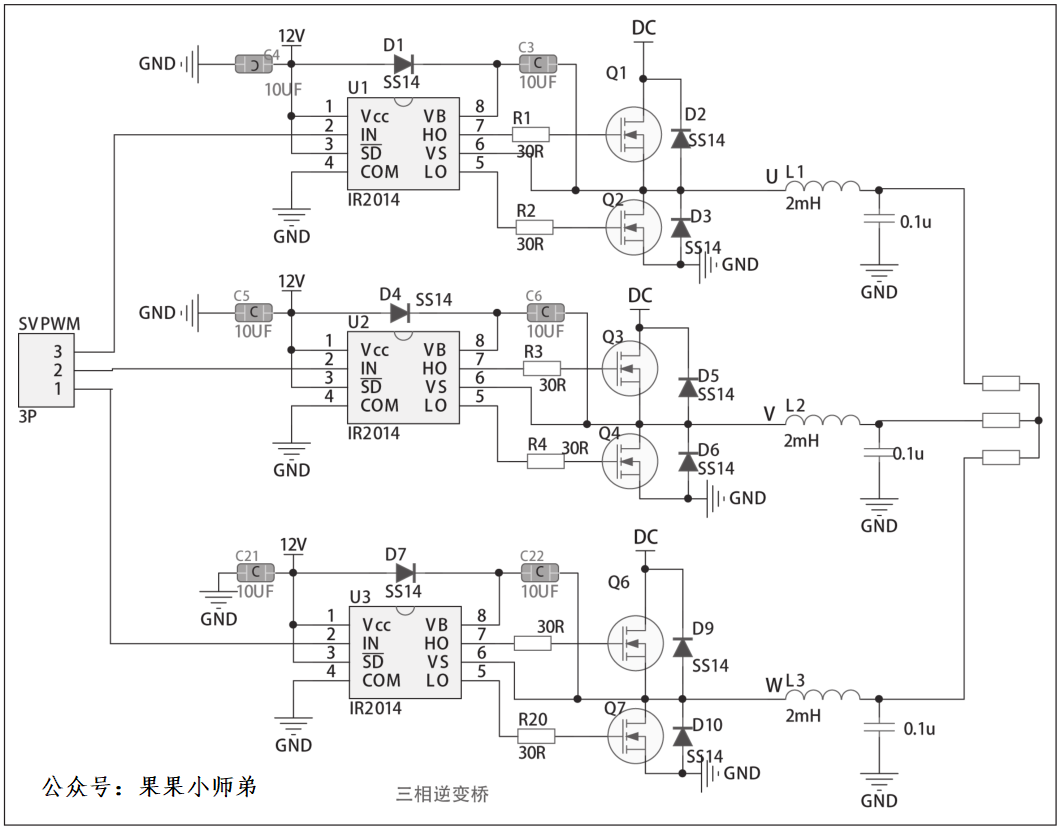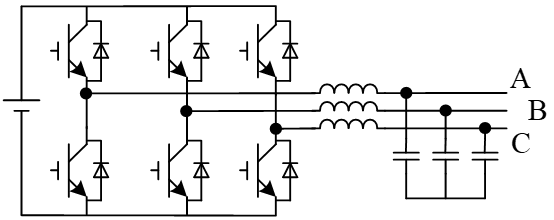 微电网模拟系统由两个三相逆变器并联构成,作为系统的核心部分,三相逆变电路采用半桥并联结构,完成直流电到三相交流电的转换。两部分三相逆变器电路完全一样,其中一个三相逆变器电路如下图所示。