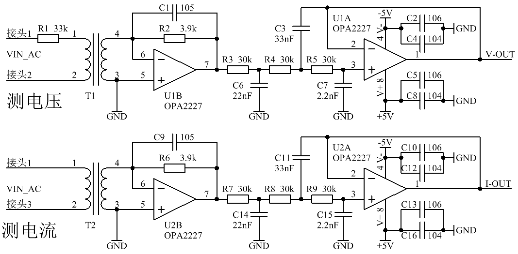 方法二:采样电路是系统实现反馈控制保证系统稳定的关键部分。具体电路如下图6所示。电压互感器TV1013-1H和电流互感器TA12-200实现了强电与弱电的隔离,同时将三相逆变电路输出的高电压、大电流转换为易于采集的小电压信号,后级3阶有源低通滤波器对互感器输出信号进一步调理后输出给单片机采样。