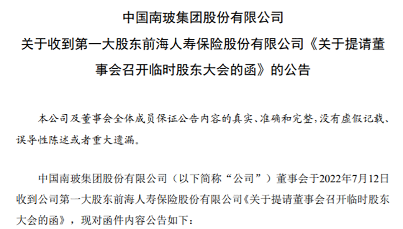 7月17日晚,南玻A公告,公司第一大股东前海人寿保险股份有限公司(下称“前海人寿”)提请召开临时股东大会,审议议案涉及补选沈成方为非独立董事等。但南玻A董事会未通过该项议案,监事会则以紧急会议的方式全票通过。