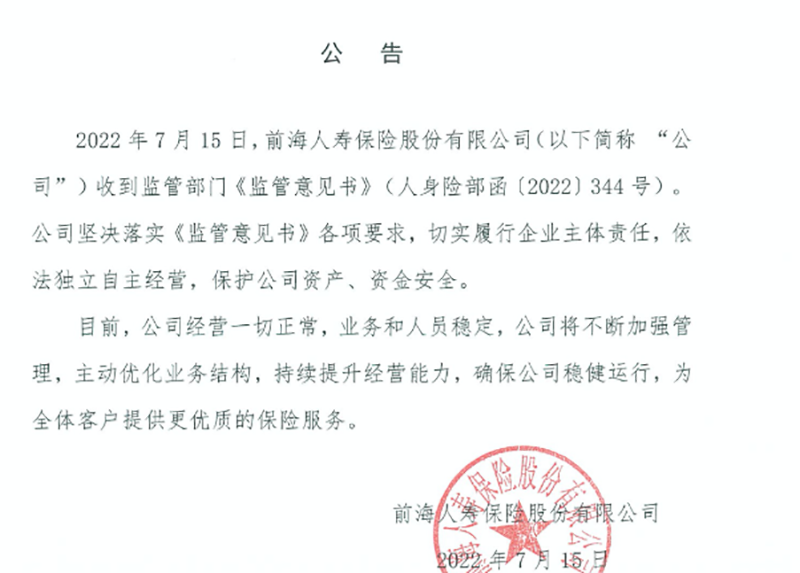 严禁股东不当干预前海人寿经营