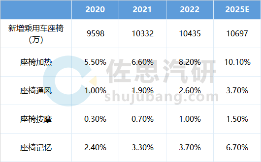 2020-2025新增乘用车座椅数量及功能装配率预测